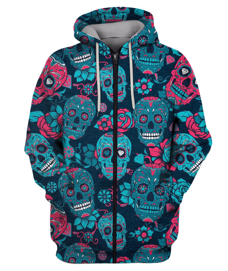 Skull With Floral Ornament And Flower Zip Hoodie
